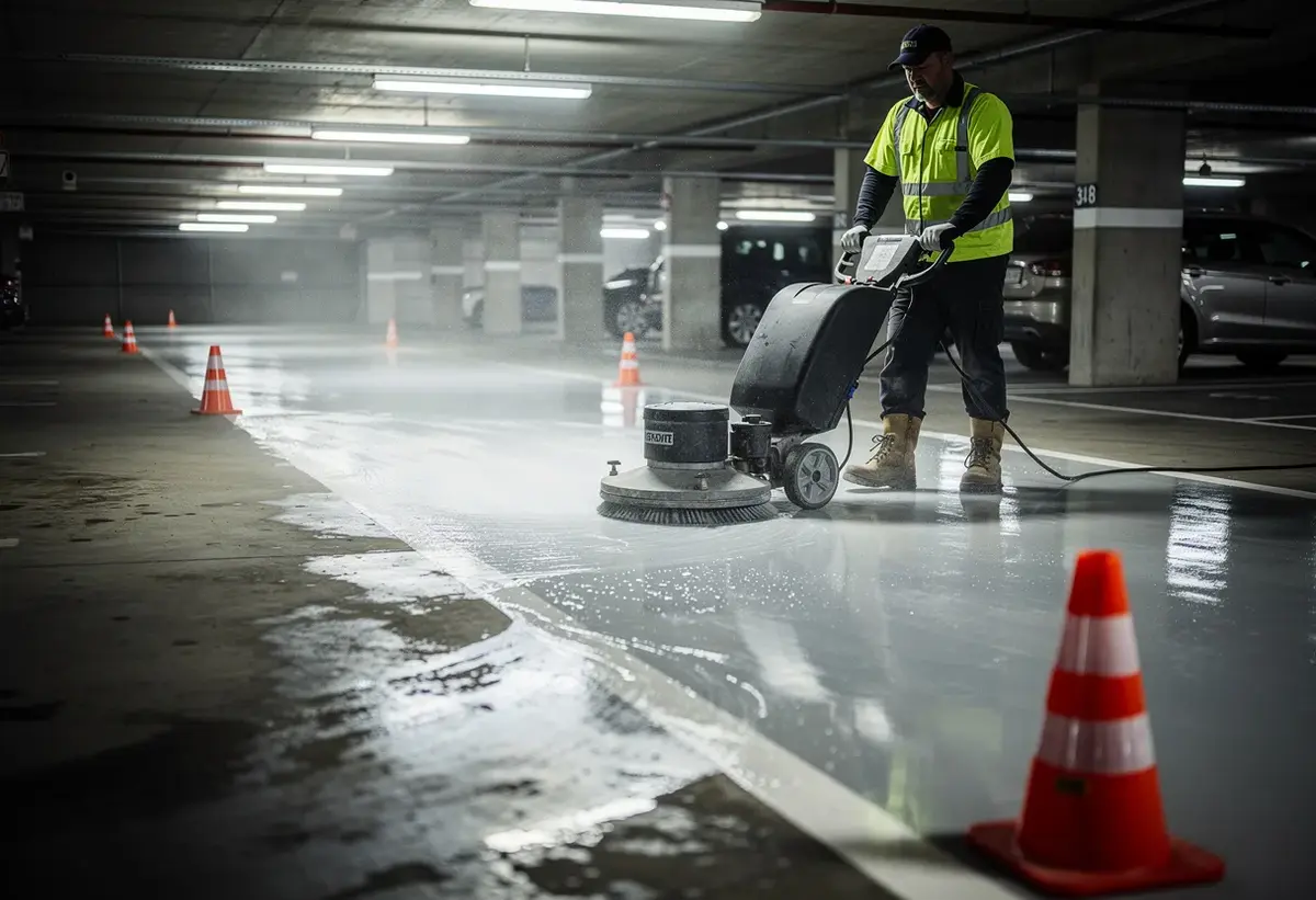Limpieza integral de parkings de comunidades de vecinos: barrido mecánico, fregado con máquina rotativa, eliminación de manchas de aceite y grasa, limpieza de pilares y señalización.